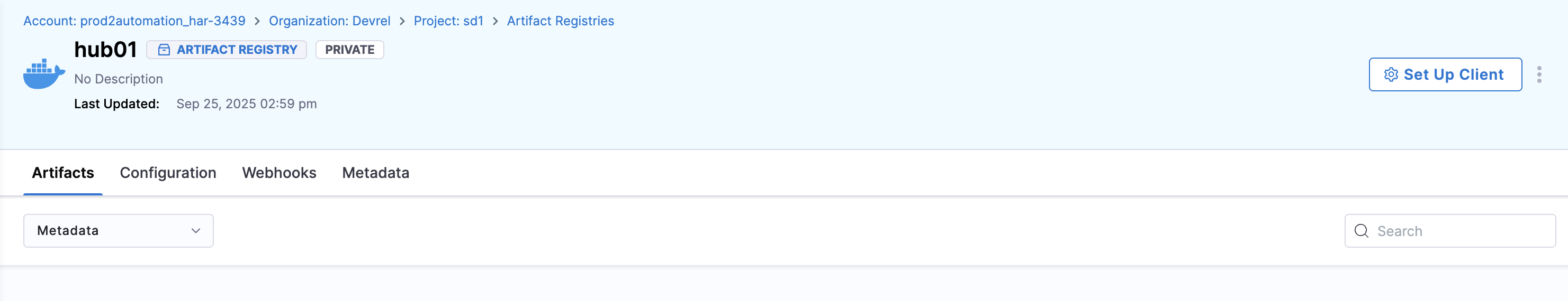 All artifact operations start with the Setup Client page found inside your registry at the top right.