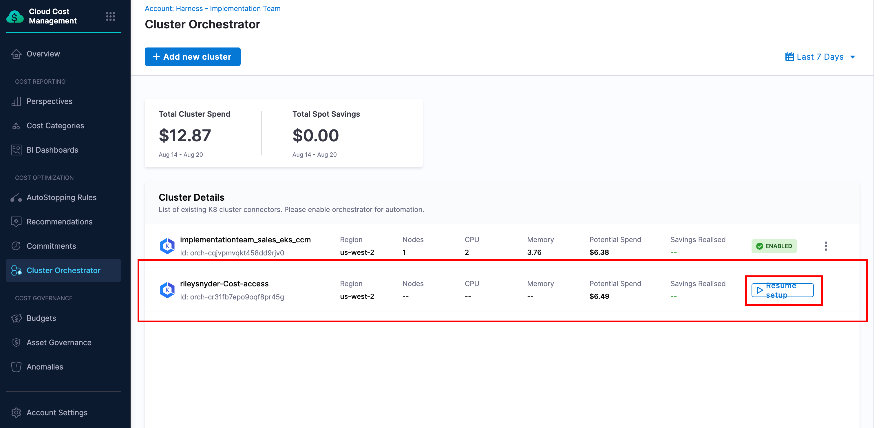 Navigate to the CCM module, and select Cluster Orchestrator from the side menu. You should see a list of clusters that have been set up or are pending. Find the cluster you are onboarding and click Resume Setup.