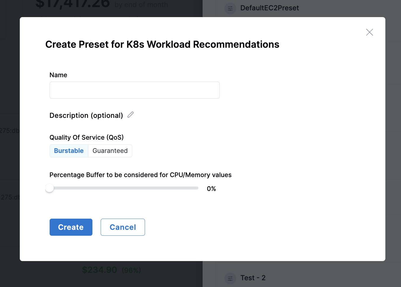 | Percentage Buffer for CPU/Memory | Additional resource margin to handle unexpected spikes in usage. Higher buffer values provide more headroom for workload fluctuations but increase resource allocation. |