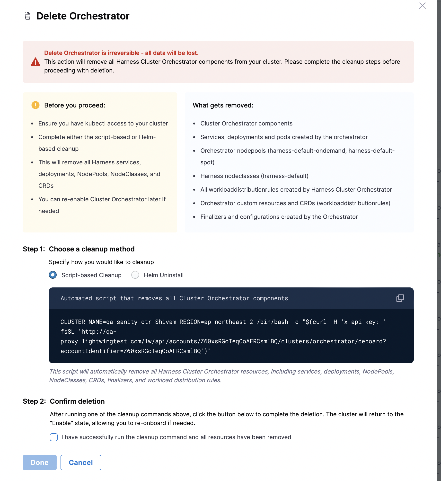When proceeding with the deletion, you will be prompted to choose a cleanup method. Choose either Script-based Cleanup or Helm Uninstall to remove all Harness Cluster Orchestrator resources, including services, deployments, NodePools, NodeClasses, CRDs, finalizers, and workload distribution rules.
