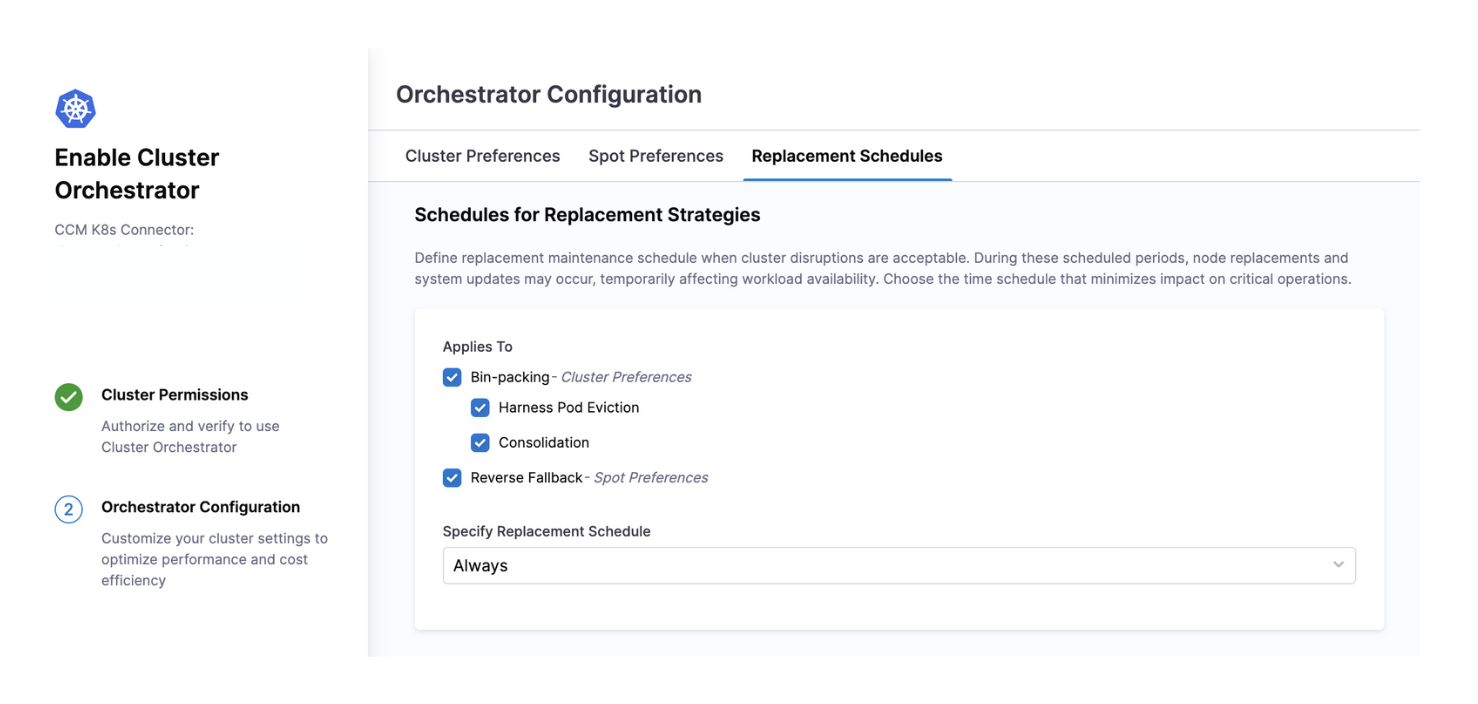 Reverse Fallback Retry: When spot instances are interrupted, Cluster Orchestrator automatically replaces them with on-demand instances (fallback). This setting controls how frequently the system attempts to replace those on-demand instances with spot instances once spot capacity becomes available again, helping you return to optimal cost efficiency.