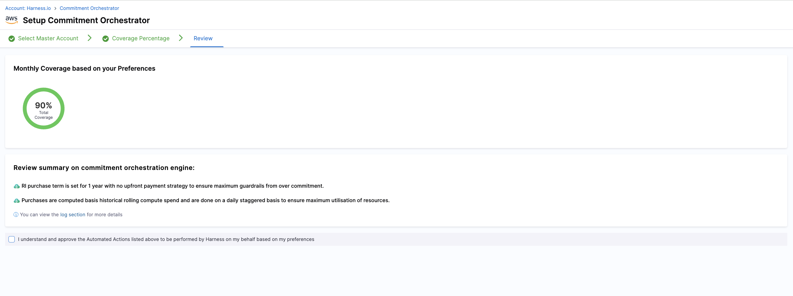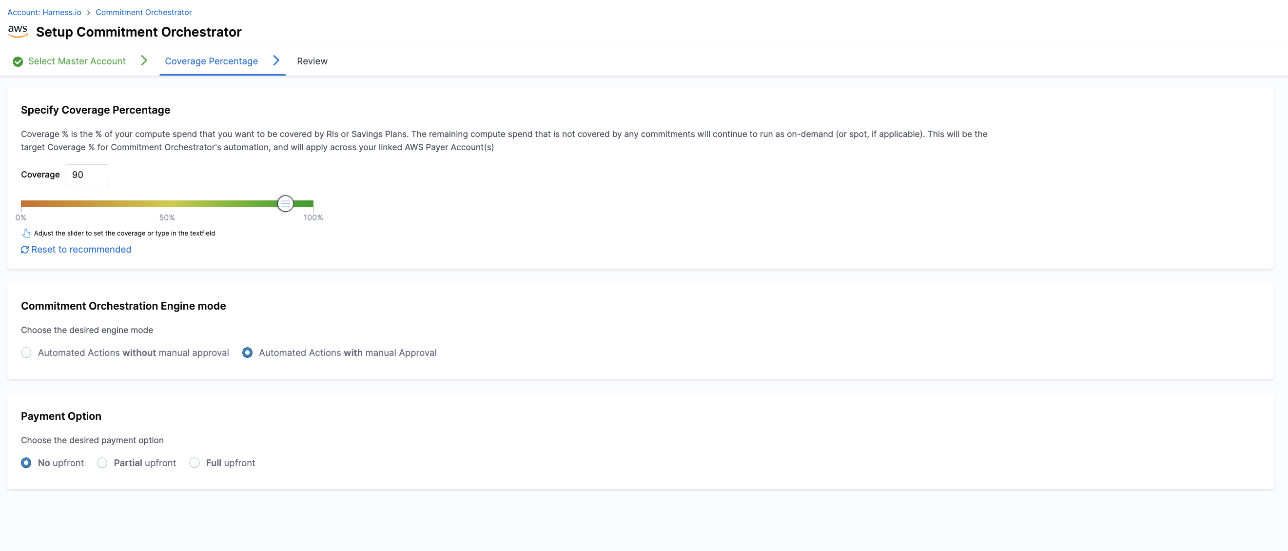 Coverage Percentage: Coverage Percentage is the Percentage of your compute spend that you want to be covered by RIs or Savings Plans. The remaining compute spend that is not covered by any commitments will continue to run as on-demand (or spot, if applicable). This will be the target Coverage % for Commitment Orchestrator's automation, and will apply across your linked AWS Payer Account(s)
