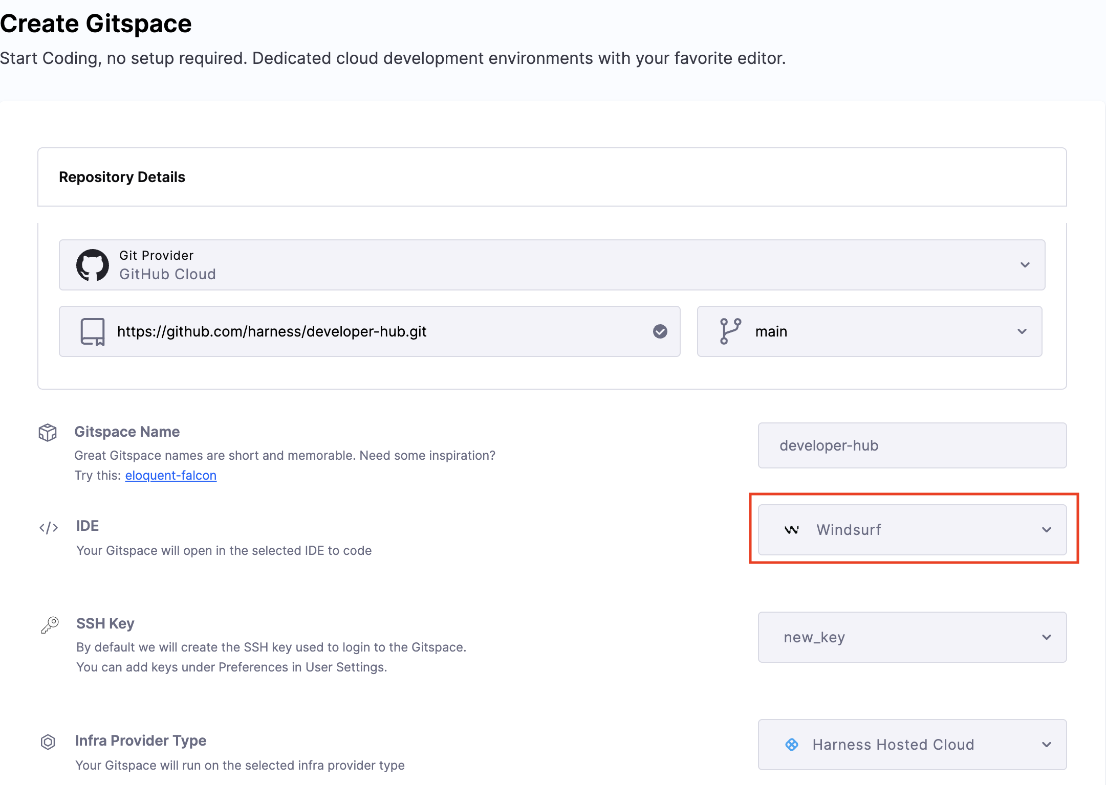2. Select "Windsurf" as the IDE during Gitspace creation.