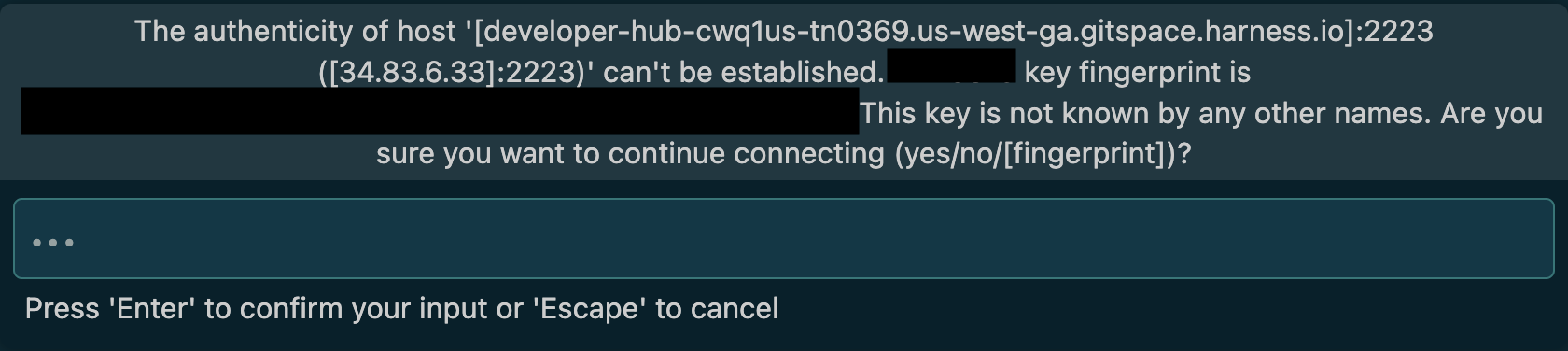 2. You'll be required to confirm the given SSH key can be used to connect, type yes in the text box and click Enter.