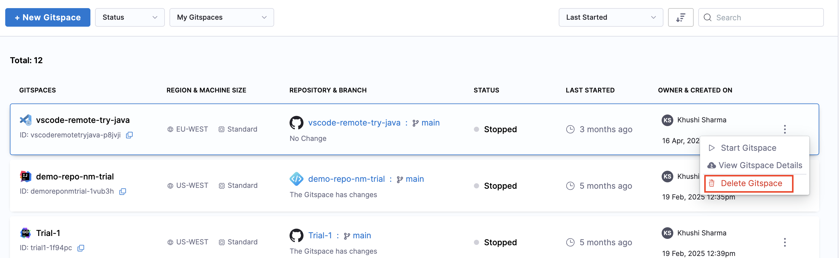- Deleting from the Gitspace Details UI