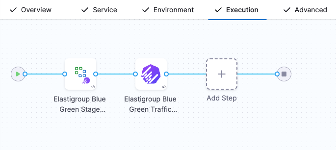 Your Execution tab now includes Elastigroup Blue Green Setup and Elastigroup Blue Green Traffic Shift steps.