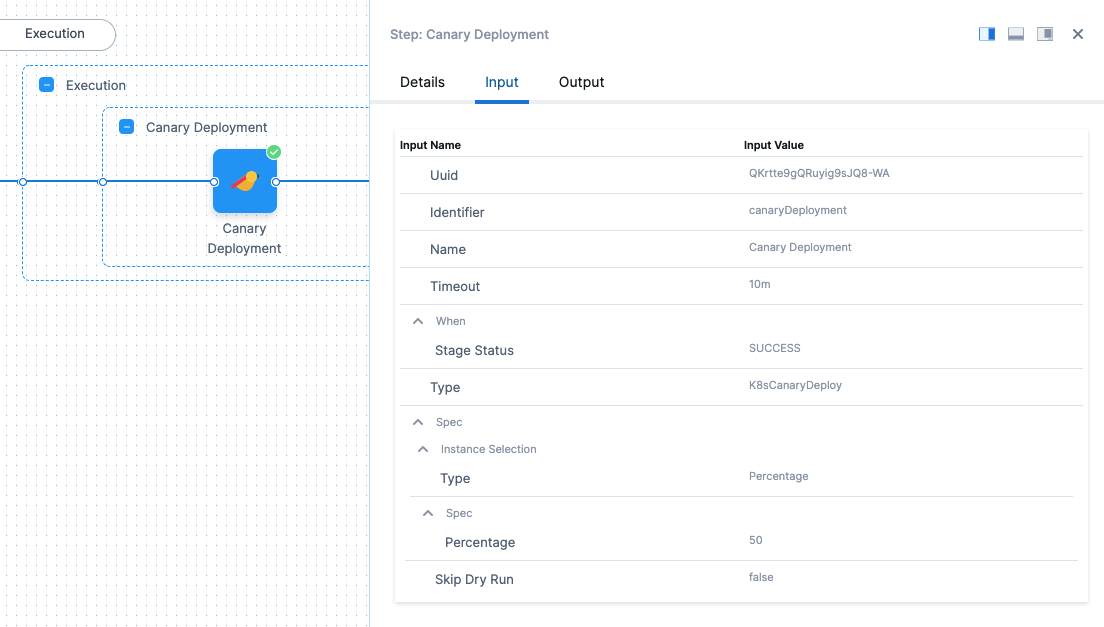 Let's look at an example where the Canary Deployment step is configured to deploy a Percentage of 50. Here is the step in the Harness Deployments page: