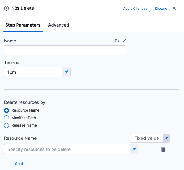 In your Harness stage Execution, click Add Step, and select K8s Delete. The K8s Delete settings appear: