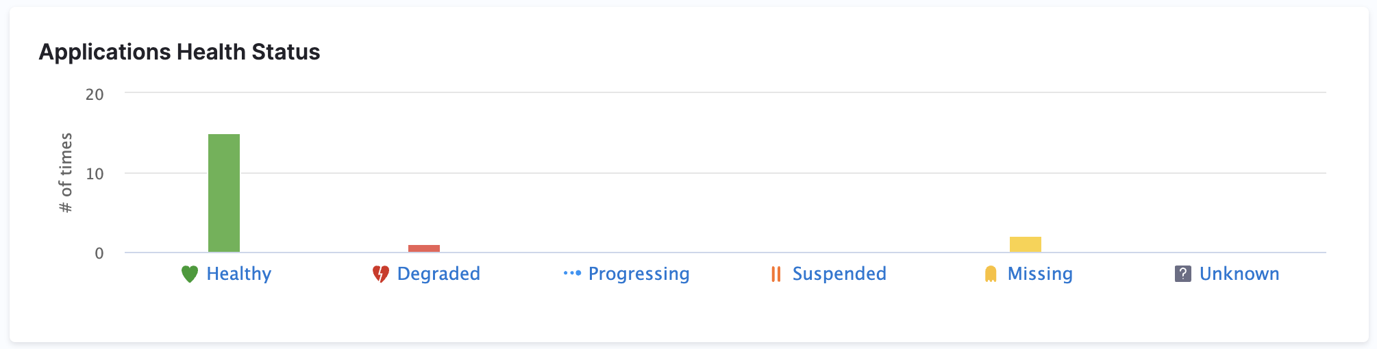 On the GitOps Overview page, you’ll find the Applications Health Status bar chart, which shows how many applications are in each of these states: