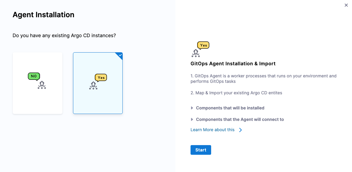4. In Agent Installation, in Do you have any existing Argo CD instances, select Yes, and then select Start.