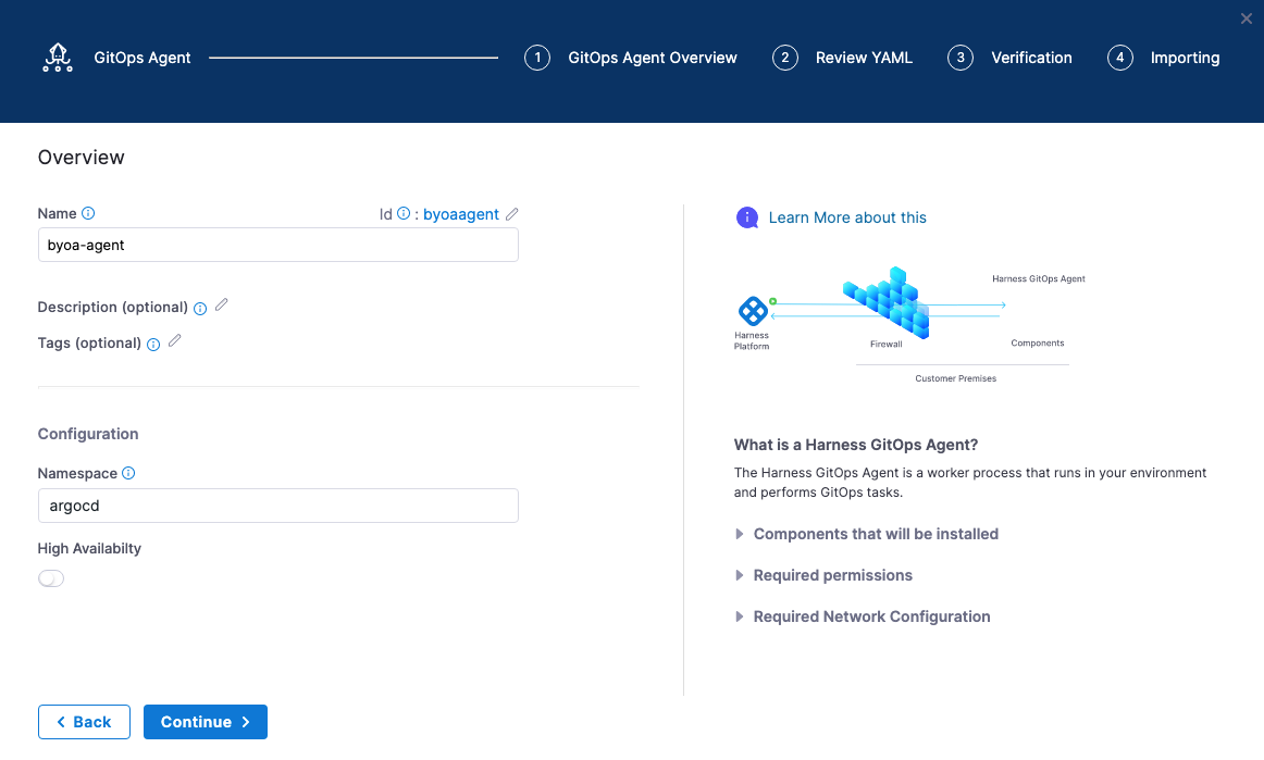 12. In the Harness GitOps Agent installer, select Continue.