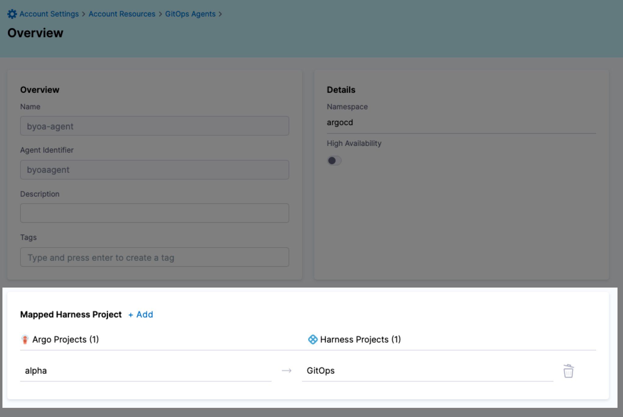 • A non-BYOA setup does not support mapping multiple Argo CD projects to a single Harness project.