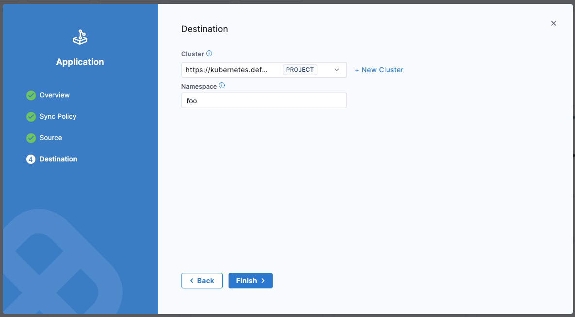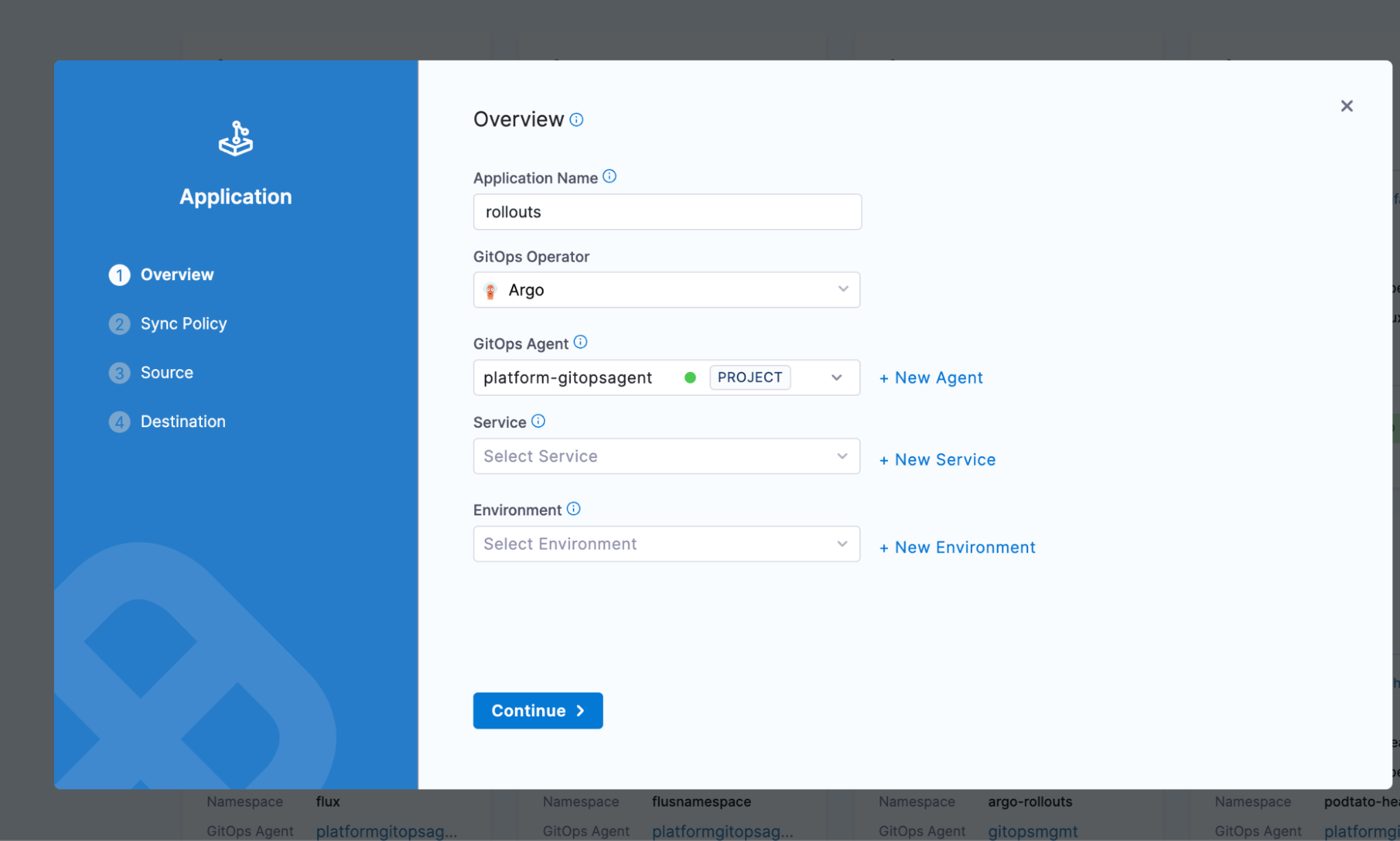 1. Create a new Argo Application. Choose the proper GitOps agent, and optionally add a service and environment.