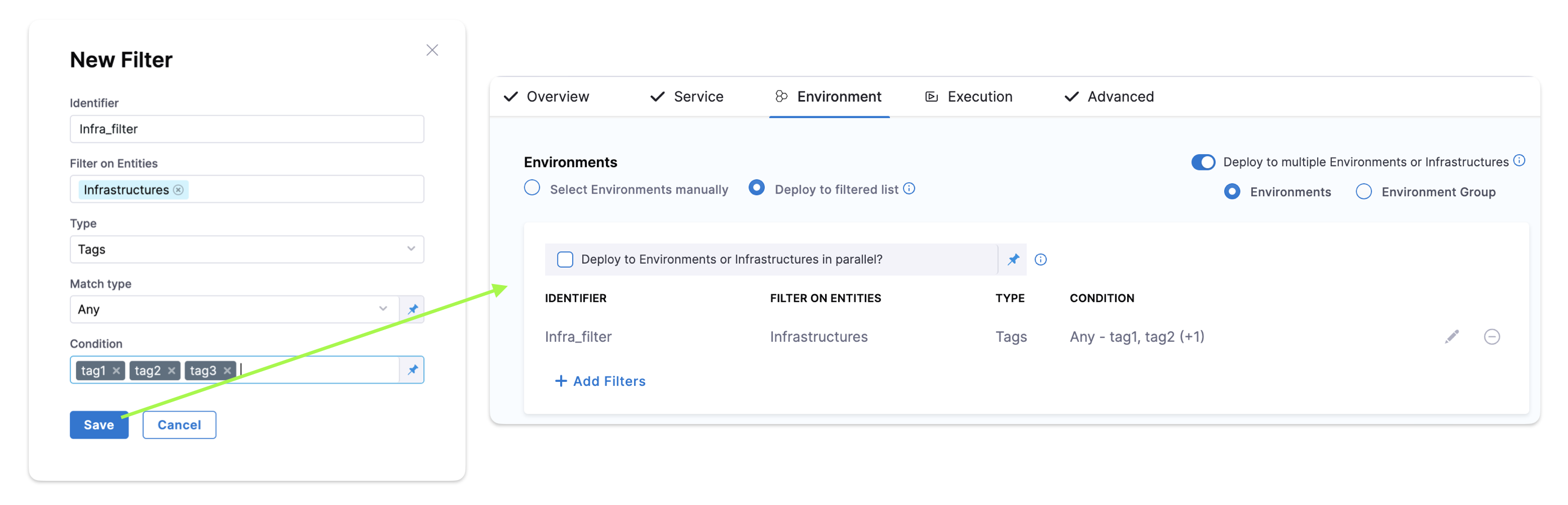 4. In Environments, enable Deploy to multiple Environments or Infrastructures. You can select one or more environments, and then one or more infrastructures in each environment.