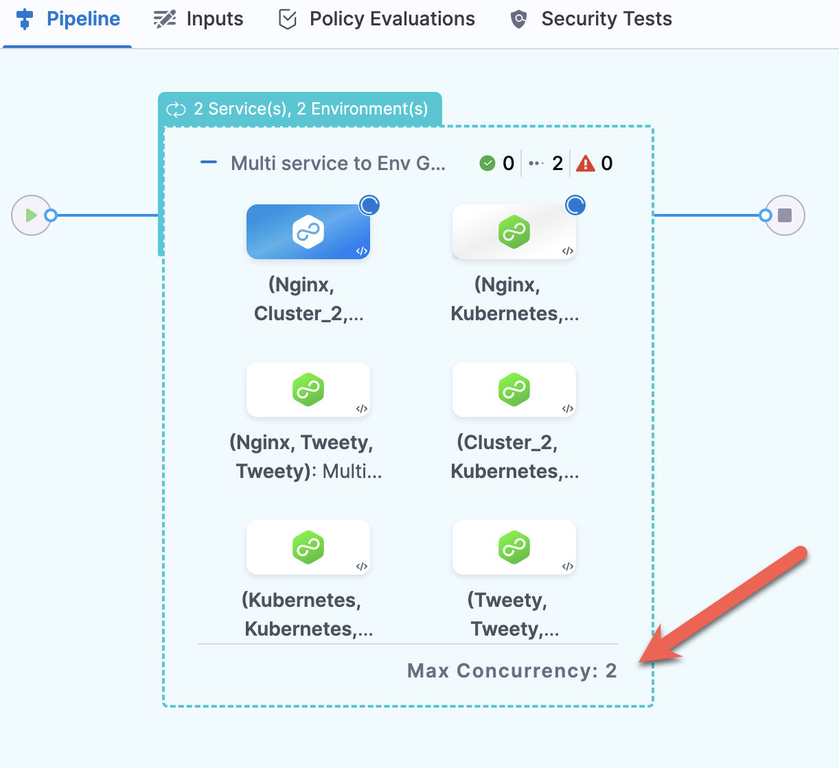• If you select Deploy services in parallel and Deploy to Environments or Infrastructures in parallel, Max concurrency is equal to the number of services multiplied by the number of environments.
