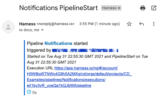 Along with the start date and who triggered the pipeline, the email includes a link to the pipeline execution in Harness.