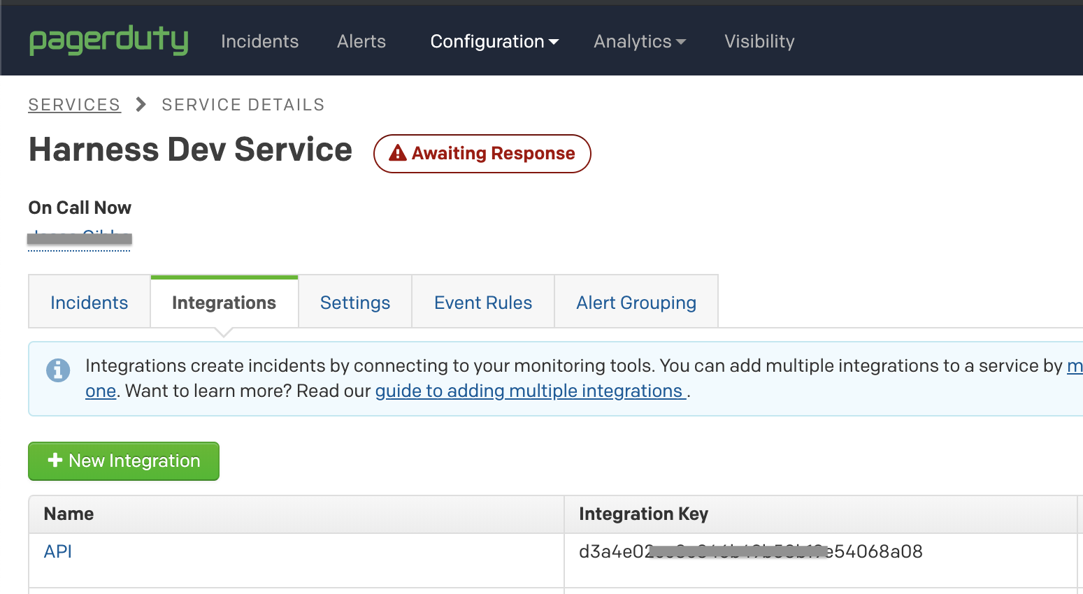 You can copy or paste this key from PagerDuty's Configuration > Services > Service Details dialog > Integrations tab, as shown below.