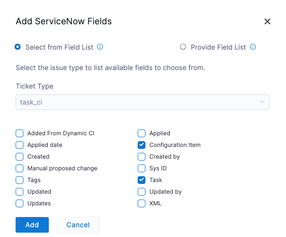 - In Add ServiceNow Fields, select Configuration Item and Task, and select Add.