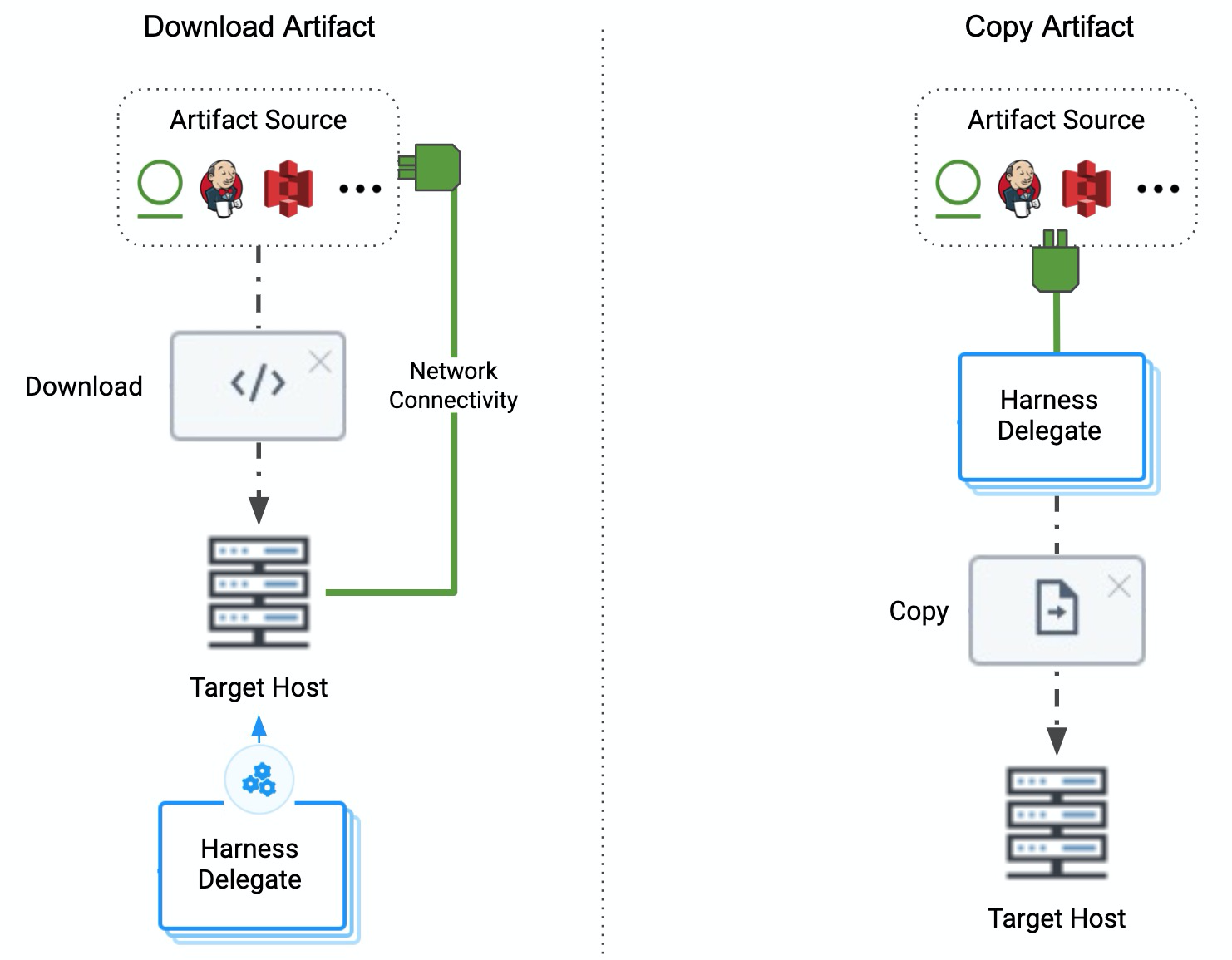 • Download: At deployment runtime, the Harness Delegate executes commands on the target host(s) to download the artifact directly to the target host(s). The delegate must have access to the target host(s) and the target host(s) must have network connectivity to the artifact server.