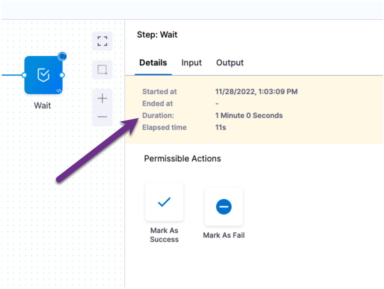 When the Wait step runs, the duration is displayed in its Details.