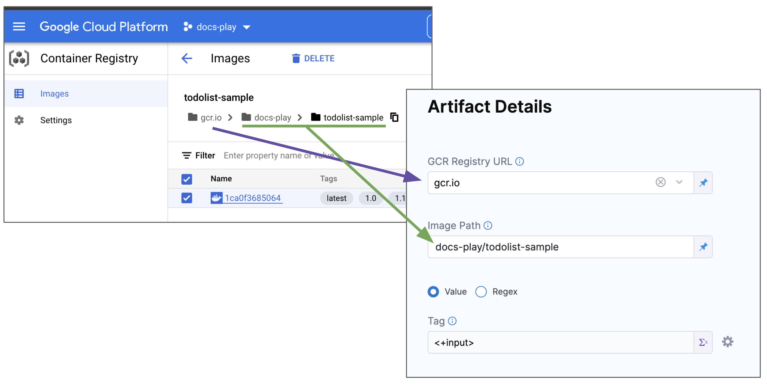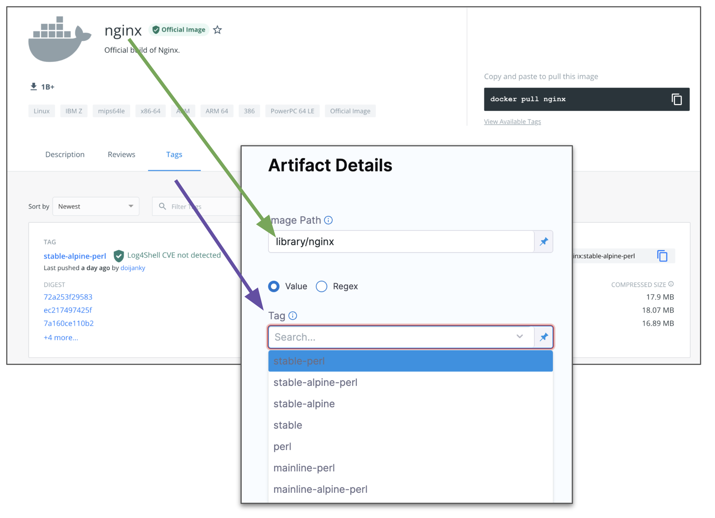 When you select the artifact repo for the artifact, like a Docker Hub repo, you specify the artifact and tag/version to use.