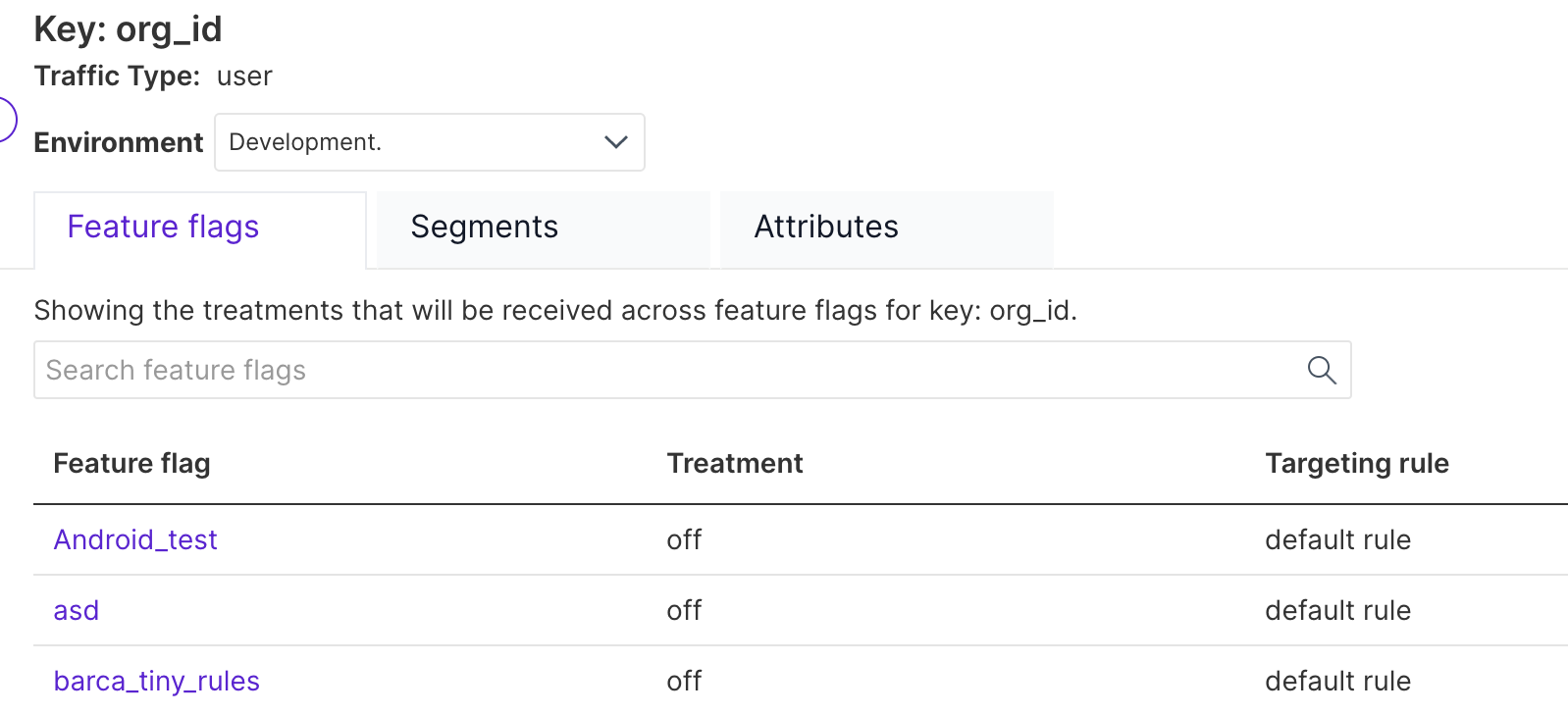 The first tab shows the treatments that are served to that customer for each feature flag in your project. Note that attributes of a customer key remain private to our SDKs, feature flags which use attributes for targeting do not show an expected treatment.