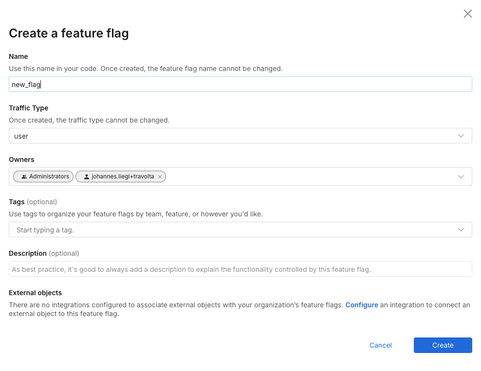 • External objects. Optionally associate a feature flag with one or more external objects, if a compatible integration is configured. Examples of integrations include Jira and Azure DevOps.