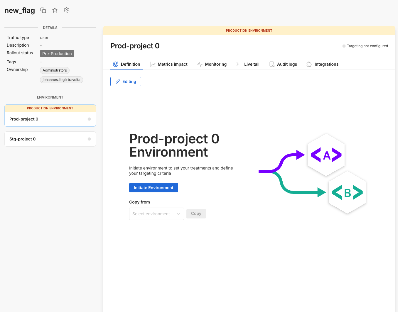 5. To configure your feature flag for a particular environment, select the environment on the left panel, and click the Initiative environment button within the Definition tab.