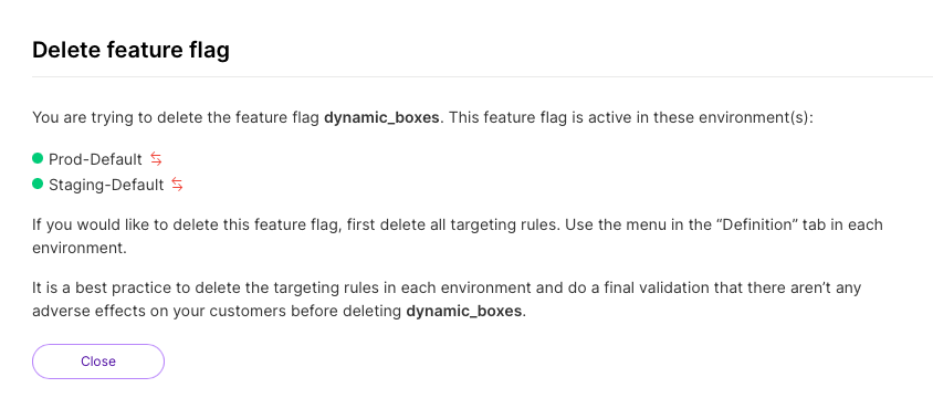 3. After all targeting rules and definitions are removed from every environment, you should be able to successfully delete the feature flag from the UI.