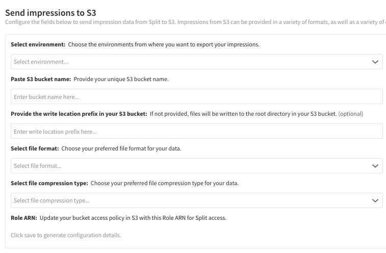 The following describes how to send Harness FME impressions to S3. Impressions are sent in batches every 30 minutes.