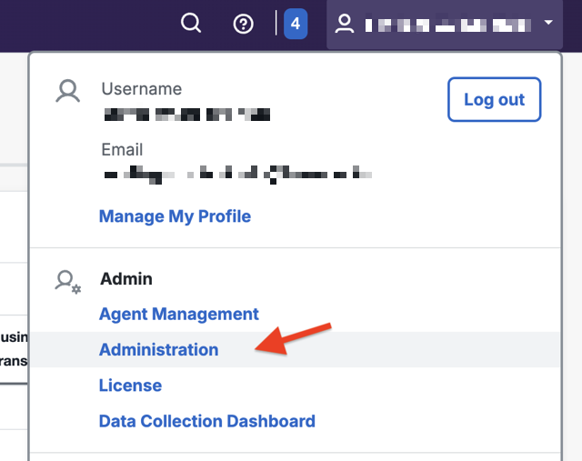 In Splunk AppDynamics, select the user profile dropdown menu on the top right corner and click Administration.
