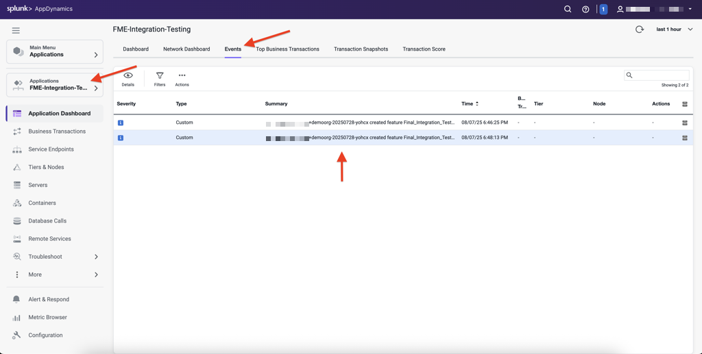 In Splunk AppDynamics, navigate to Applications and click on the application you configured in the Harness FME configuration (for example, FME-Integration-Testing). Navigate to the Events tab to see the events that capture changes in Harness FME.