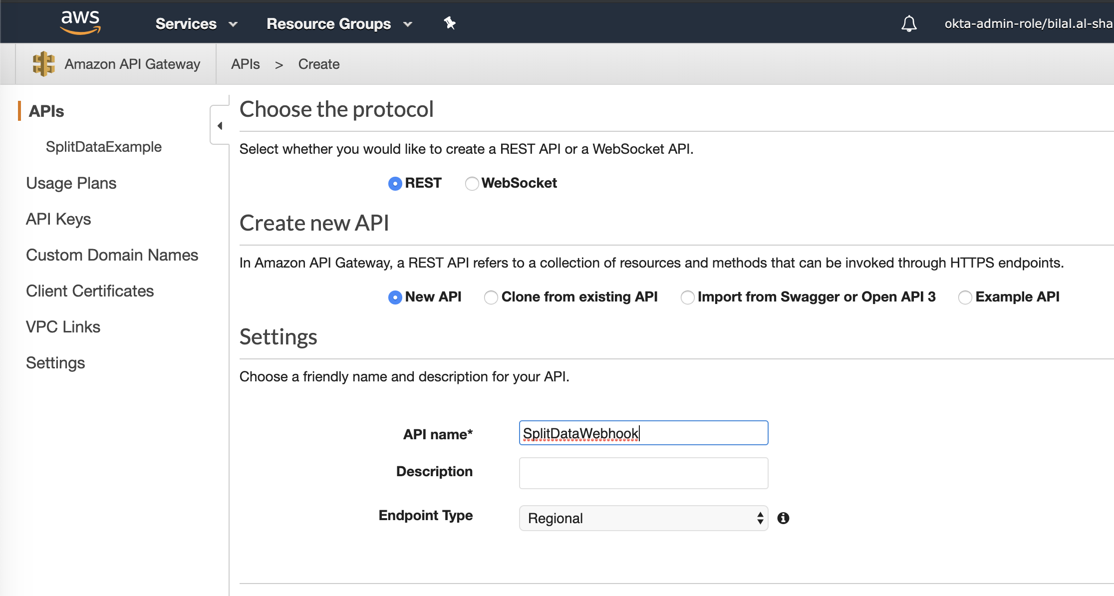15. Click on the Create API button, use Rest API and New API options, type a name for your API service, and click Create API.