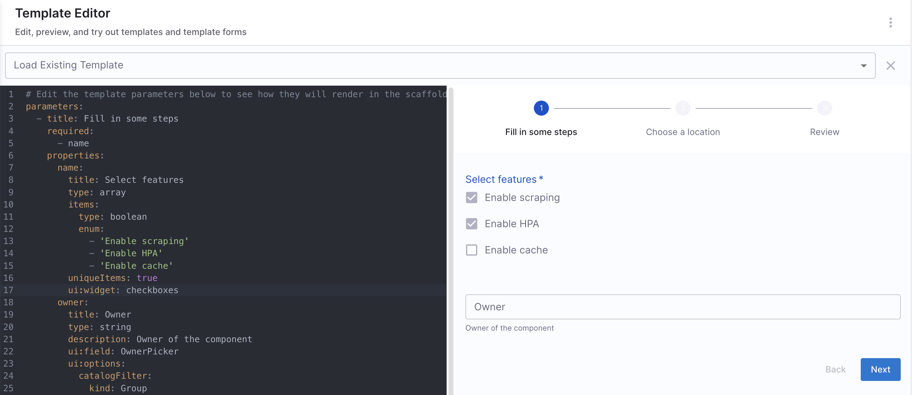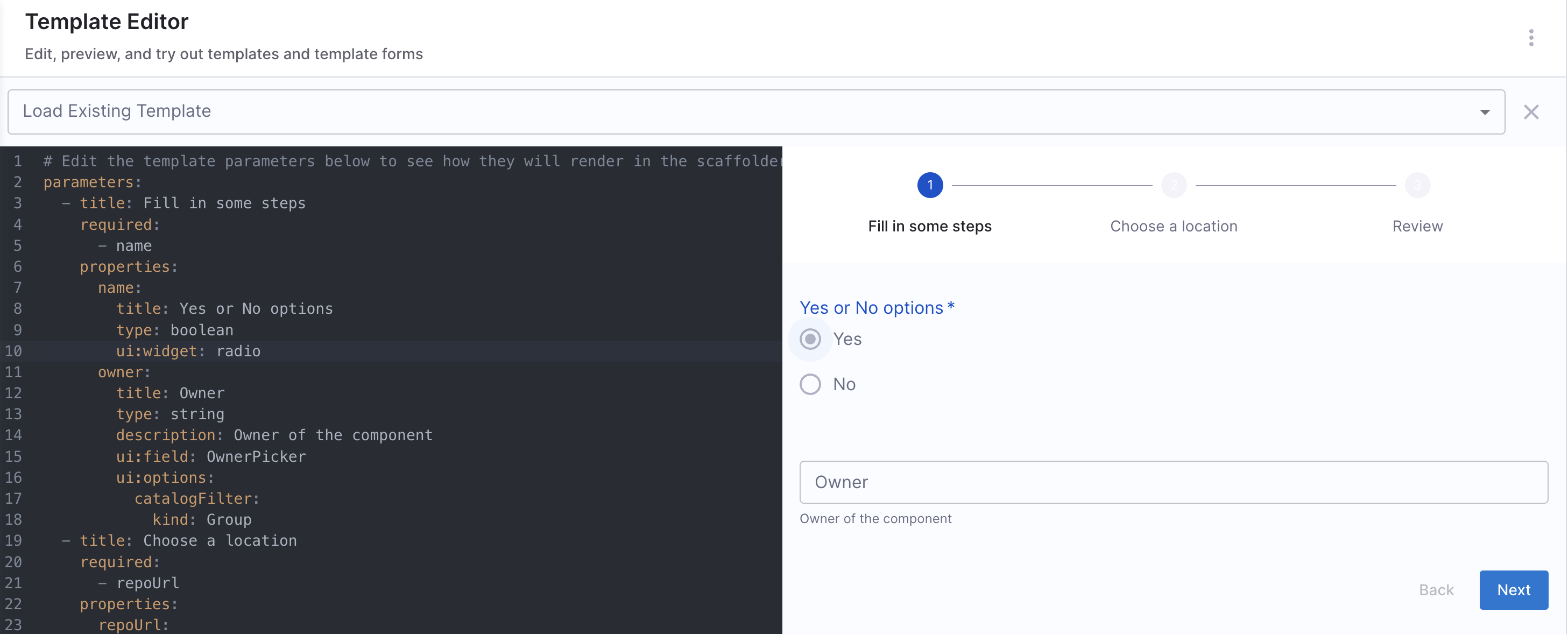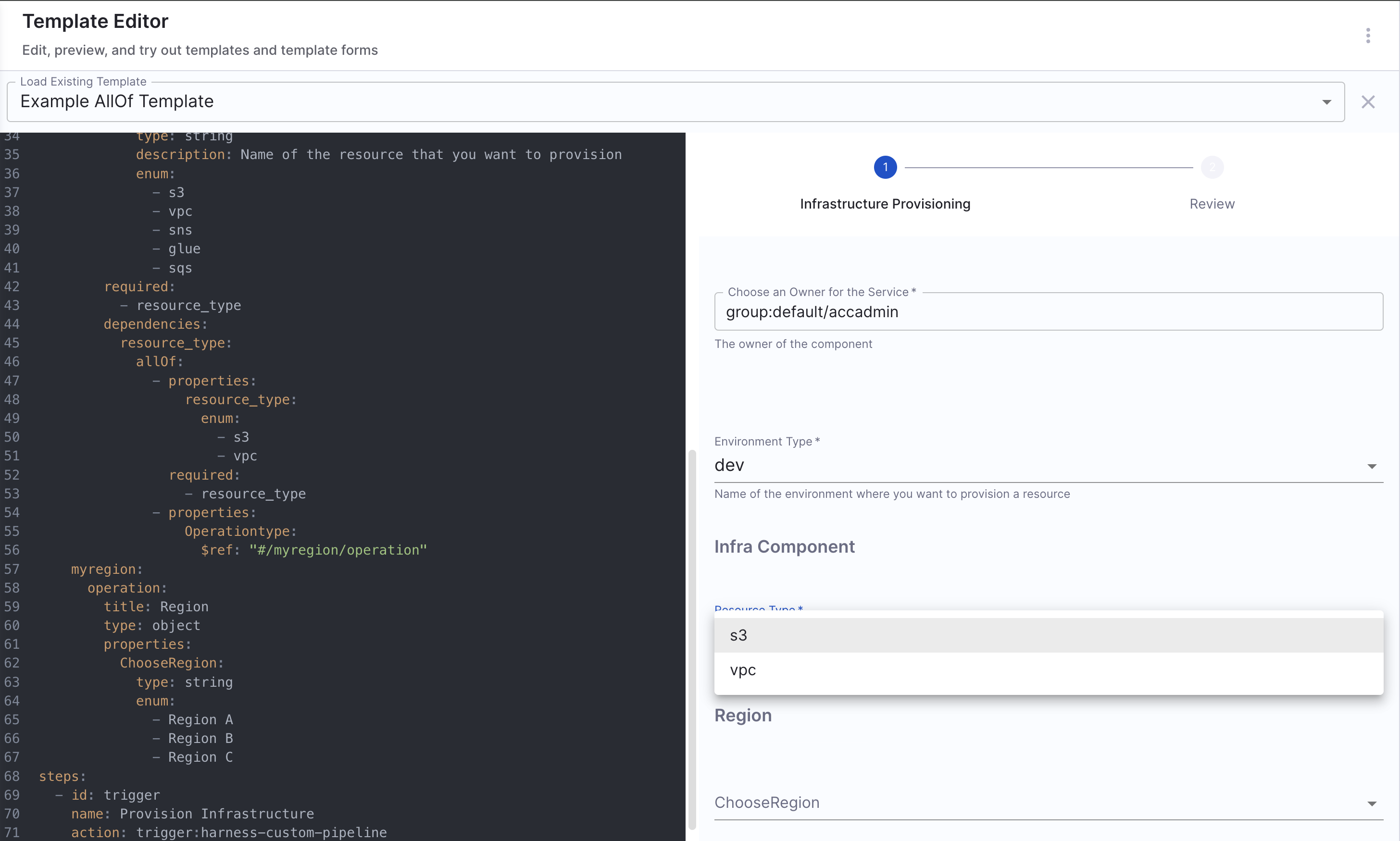 Harness IDP also provides a built-in editor to help you build your Workflow's Frontend. It offers a real-time preview of the corresponding UI based on the YAML definition. Here, you can create a new workflow or edit an existing one. '