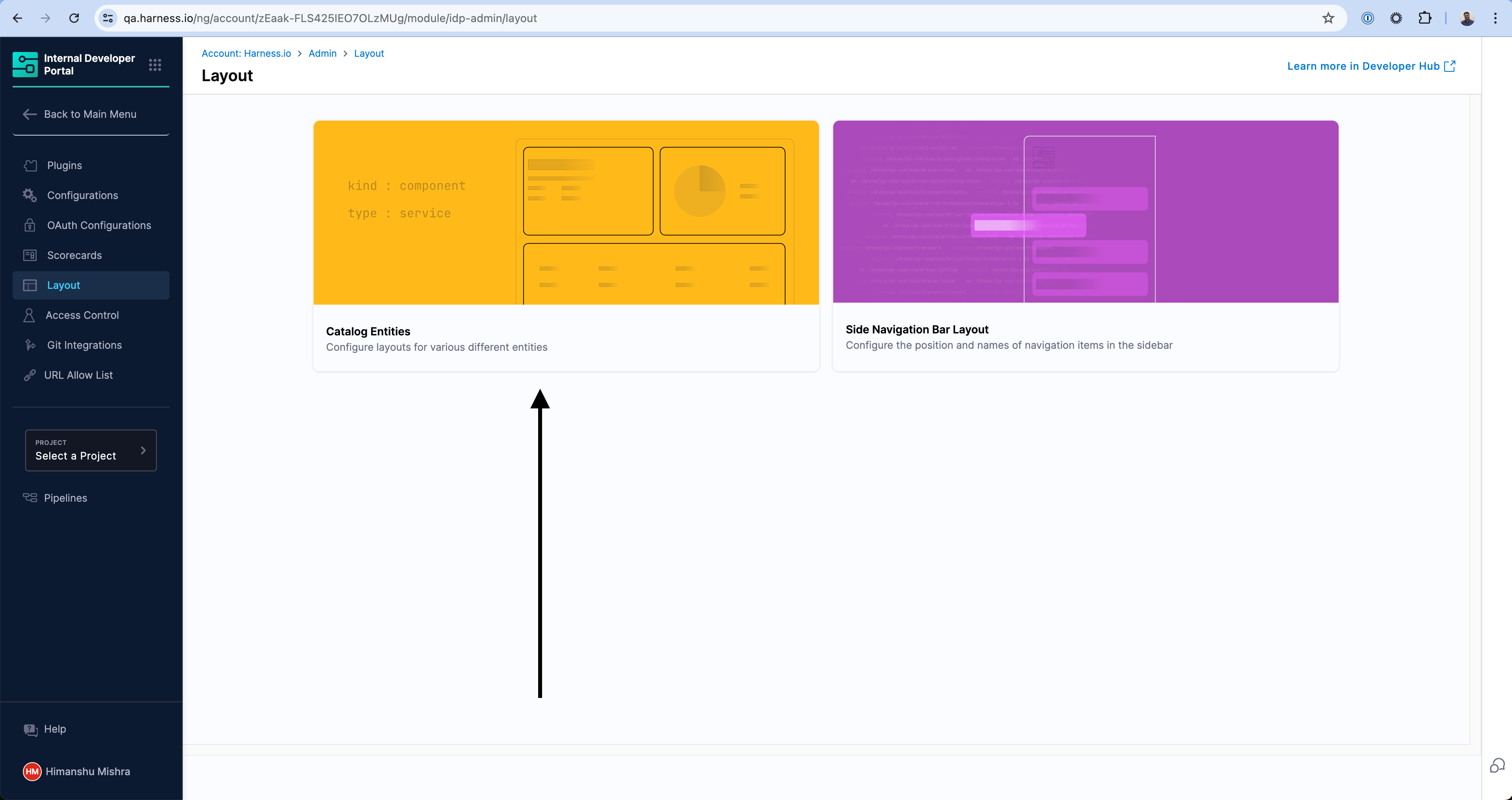 1. Go to the Layout Page and under Admin and select Catalog Entities.
