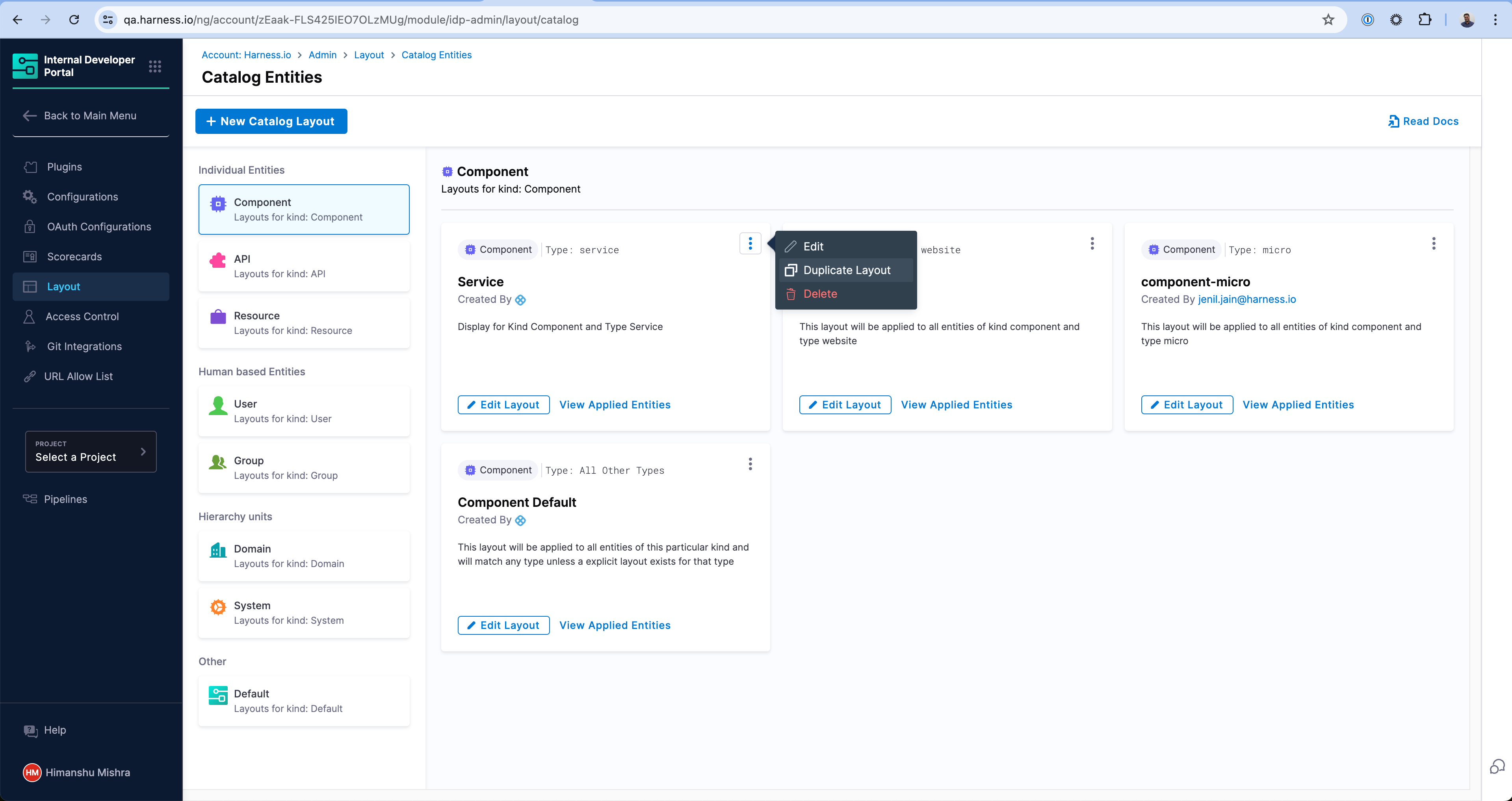The Layouts are grouped by the kind of the Catalog entities and their use-cases in the sidebar. As you can see there are a number of layouts possible for a particular kind. For example, the first layout in the screen will match any Catalog entity with kind: Component and spec.type: service. Similarly, there is a different layout for spec.type: website. At the end, there is a catch-all layout which will be used for any other type which has not been explicitly created above.