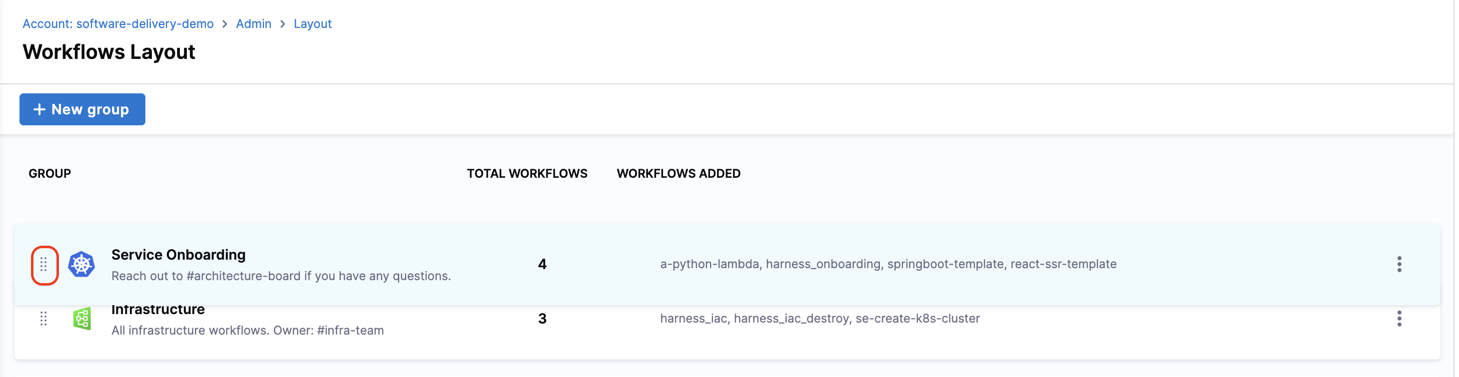 Platform Engineers (users assigned with the role of IDP Admin or having Layout edit permission) can customize the Workflows homepage under IDP Admin -> Layouts -> Workflows section by creating groups and adding Workflows to each group. These groups can be further customized using a name, icon, and description and they can be arranged in a specific order to determine how they appear on the Workflows homepage.