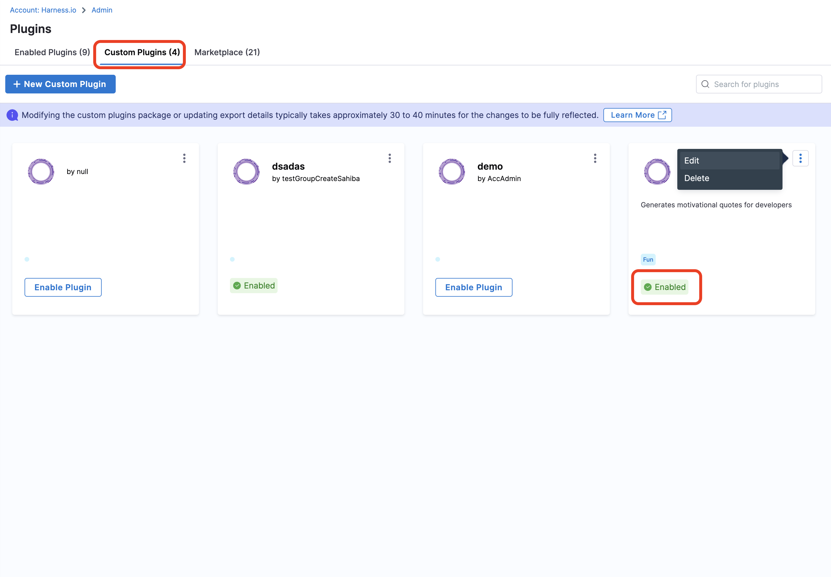 Once your Plugin is enabled you can find the plugin under Enabled Plugin tab as well as under Custom Plugin tab with Enabled tag, but you can edit or delete plugin only under custom plugins tab. Now click on the 3 dots at top of the Plugin card to edit or delete plugin.