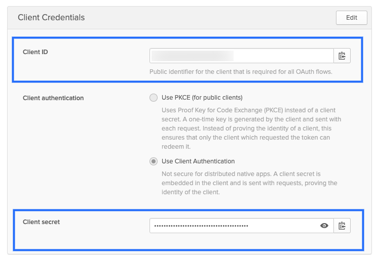 • OIDC Secret: The client secret for the app. For Okta, this is located in the Client Credentials for the app.