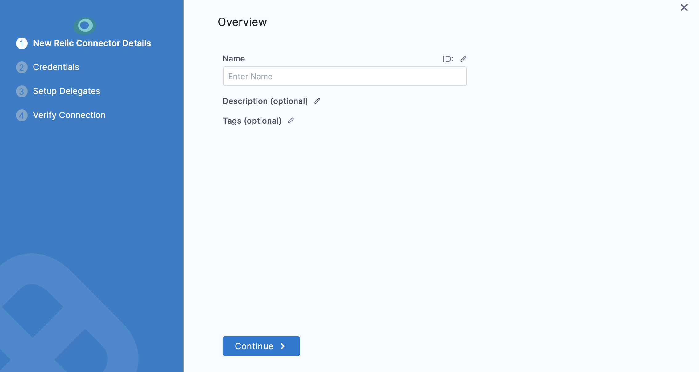 In the Overview tab, enter a name for the connector, an optional description, and a tag, and then select Continue.