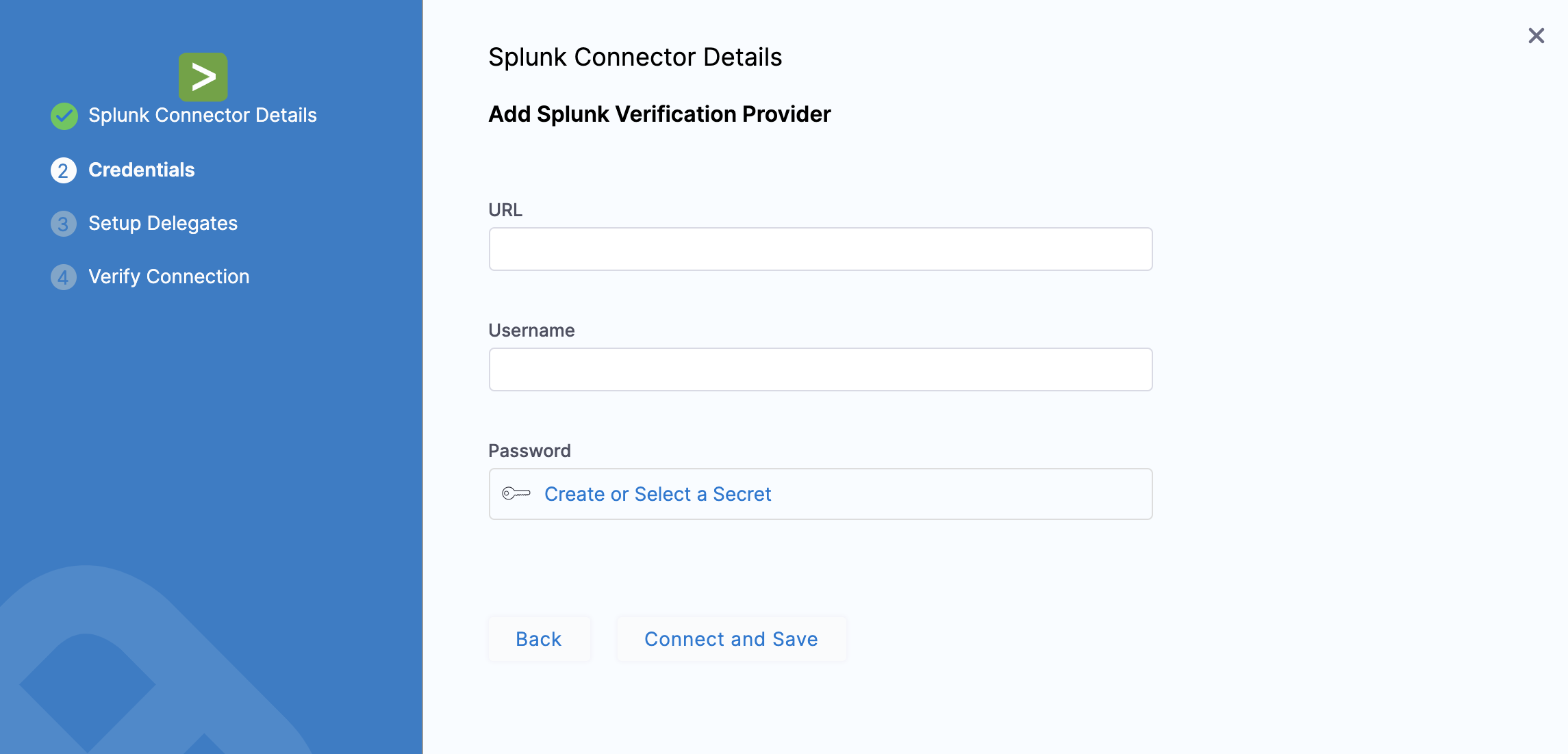 Click + Connector, and click Splunkin Monitoring and Logging Systems. The Splunk connector settings appear.