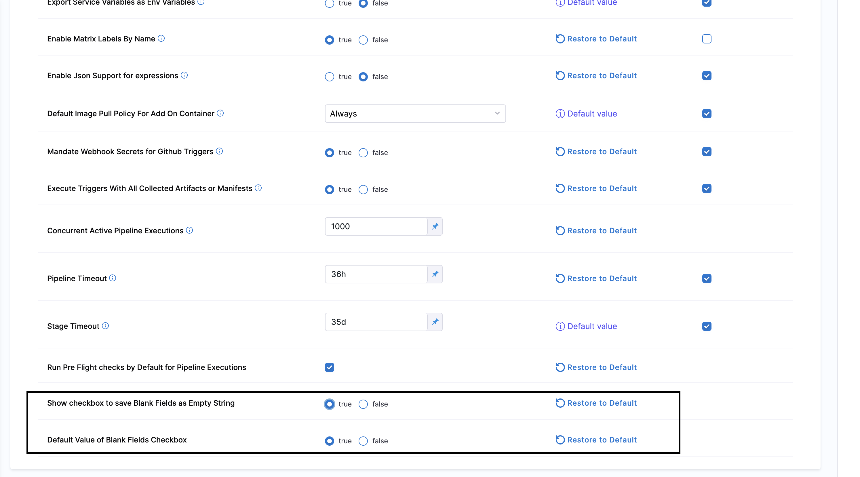 - Show checkbox to Save Blank Fields as Empty String: When enabled, this setting shows the checkbox Save Blank Fields as Empty String both when creating the input set in the Input Set section and when creating an input set in triggers, as well as in the Pipeline Run form.