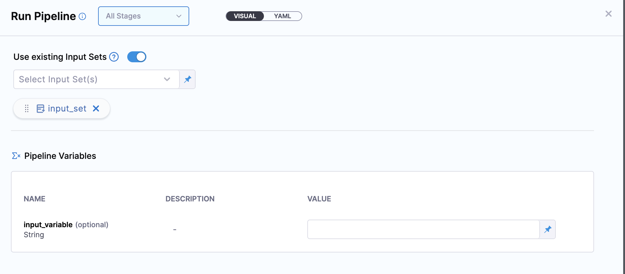 We have an input set created as well for this pipeline where we have left the value of input_variable as empty.