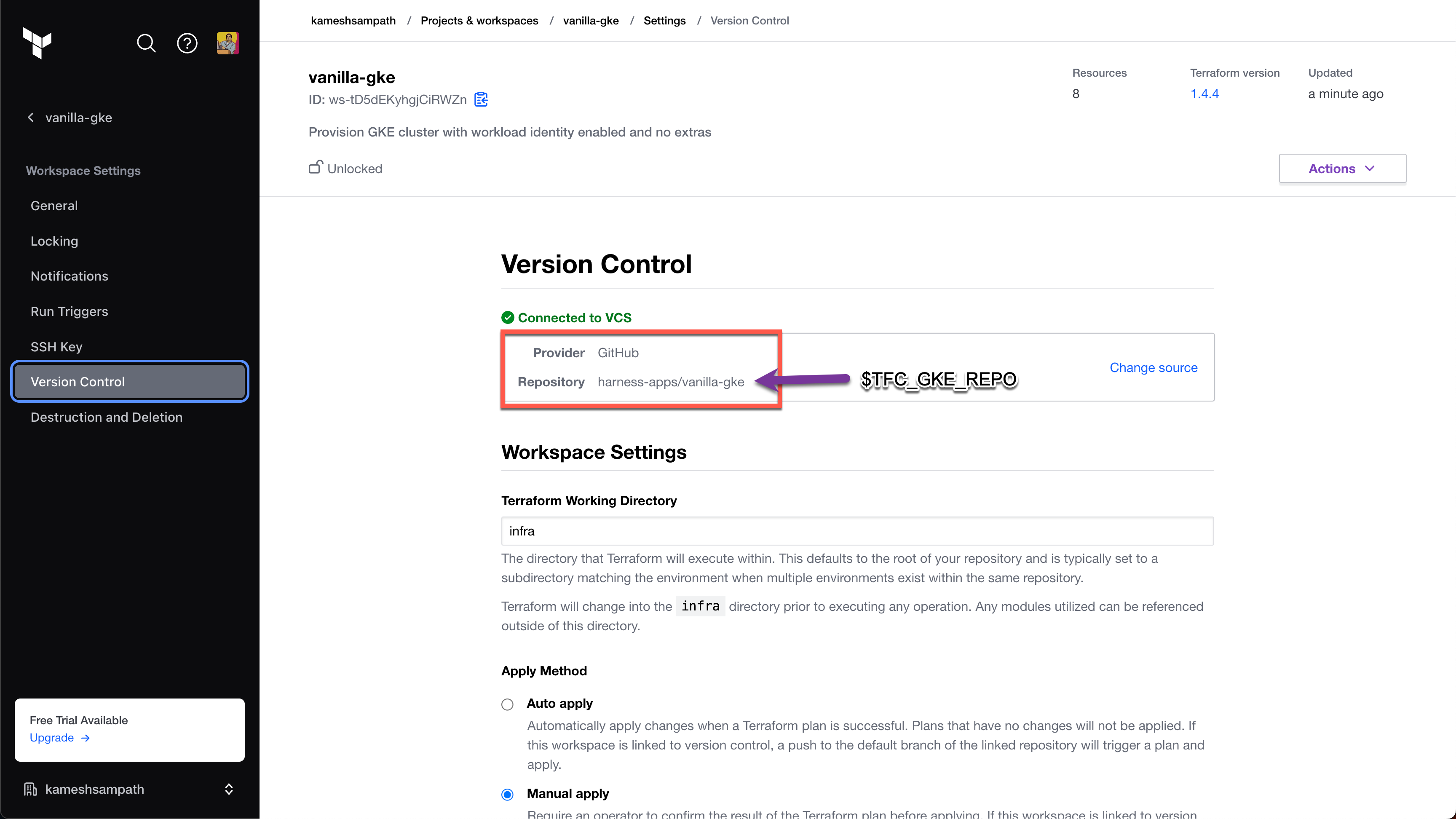 $TF_WORKSPACEand set the value to the name of your Terraform Cloud organization.
