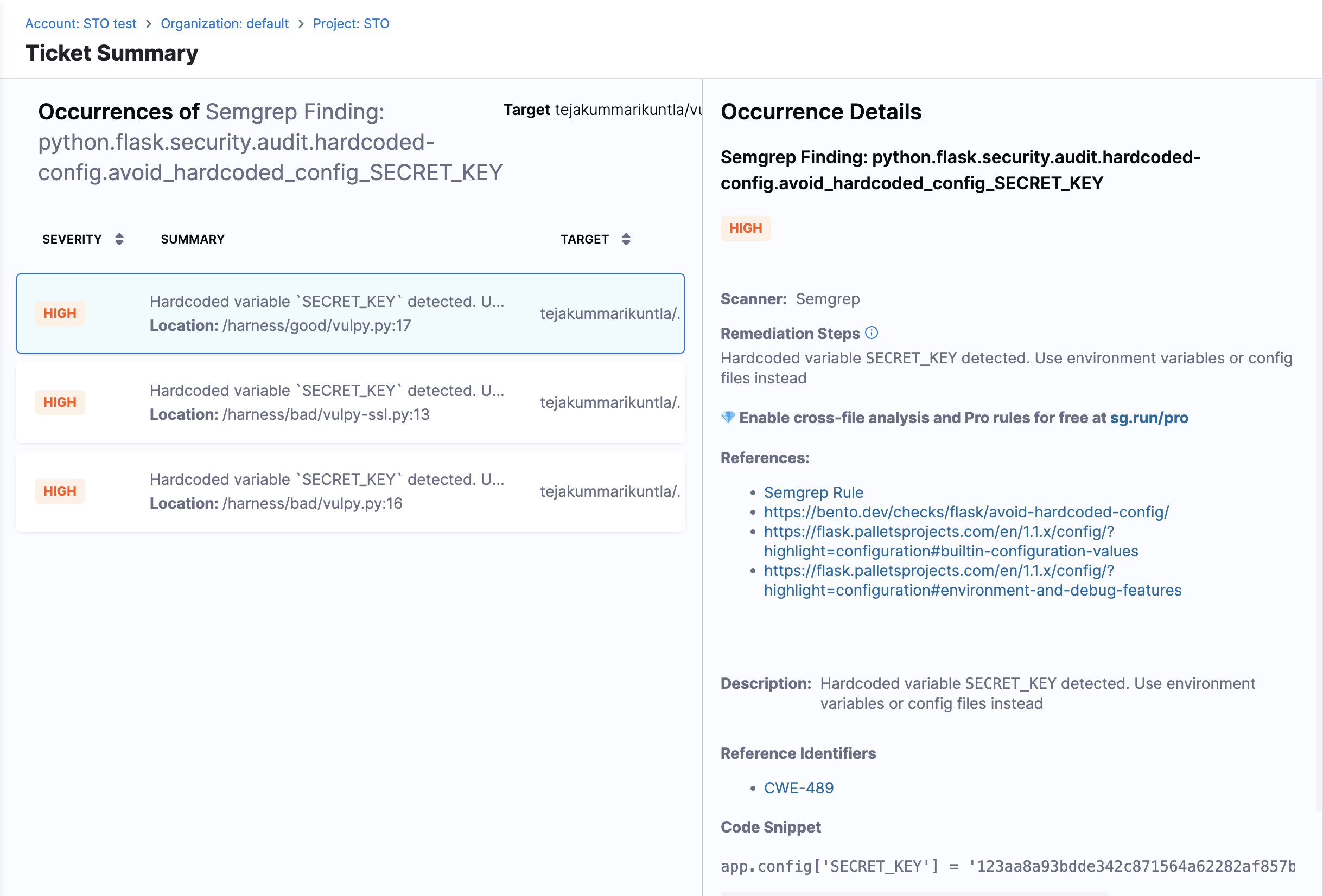 The Jira link will point to a Ticket Summary in the STO UI, which displays all detected issues tracked by the ticket.