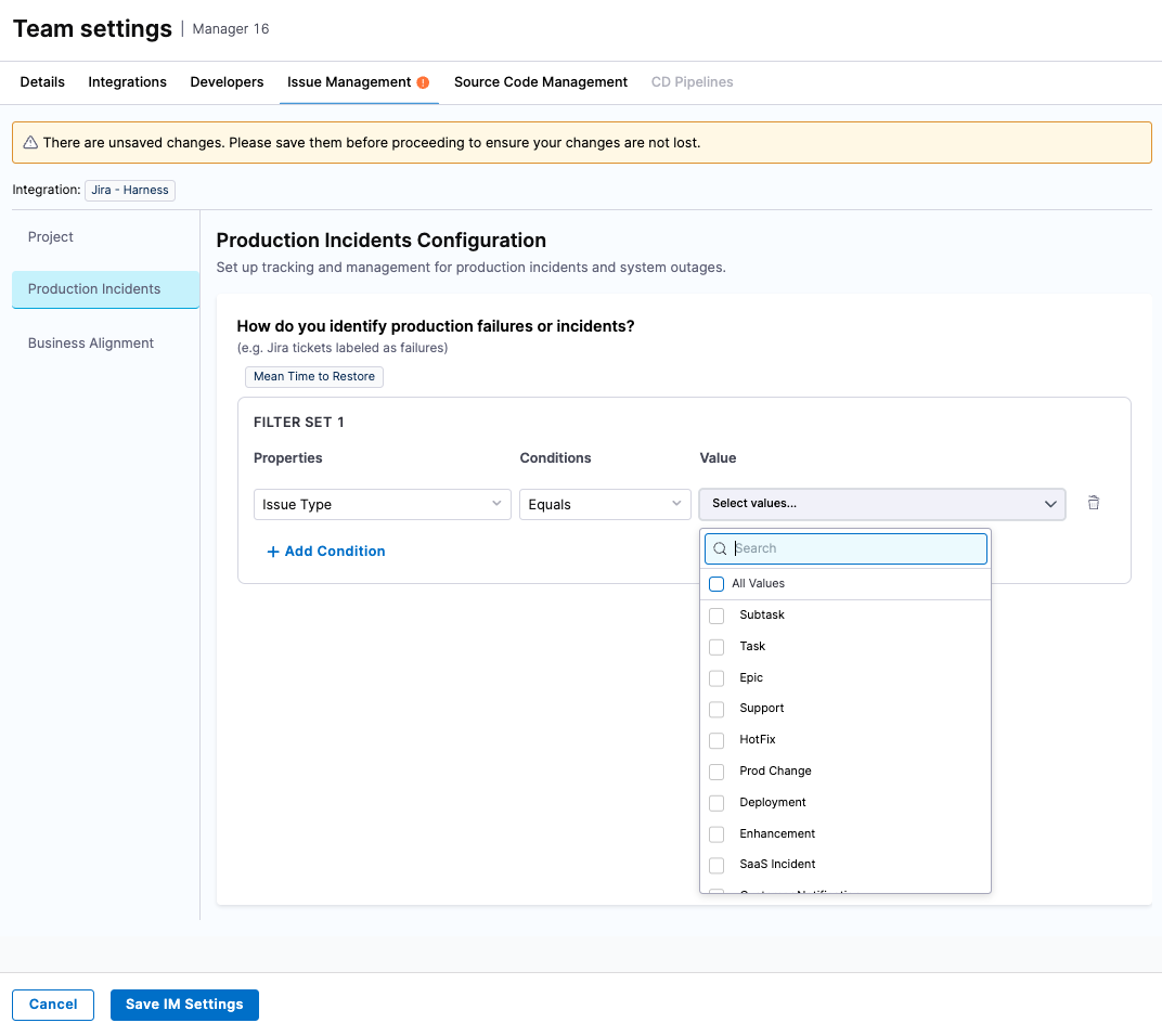 To calculate Change Failure Rate and MTTR, Harness SEI needs to know which work items represent failures or incidents. Define this using: