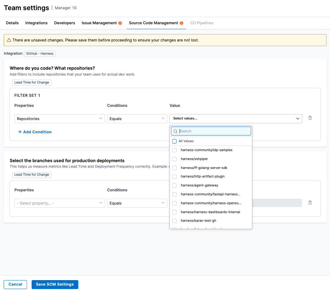 This section allows you to define how Harness SEI tracks coding activity, repository scope, and production deployments using your SCM system.