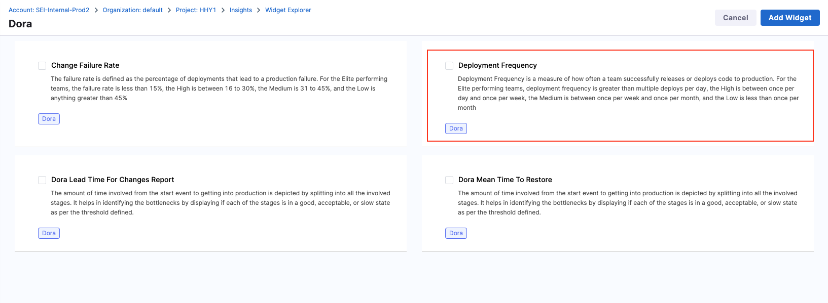 To monitor Deployment Frequency, you must create a DORA type Workflow profile and add the Deployment Frequency widget to your Insights.