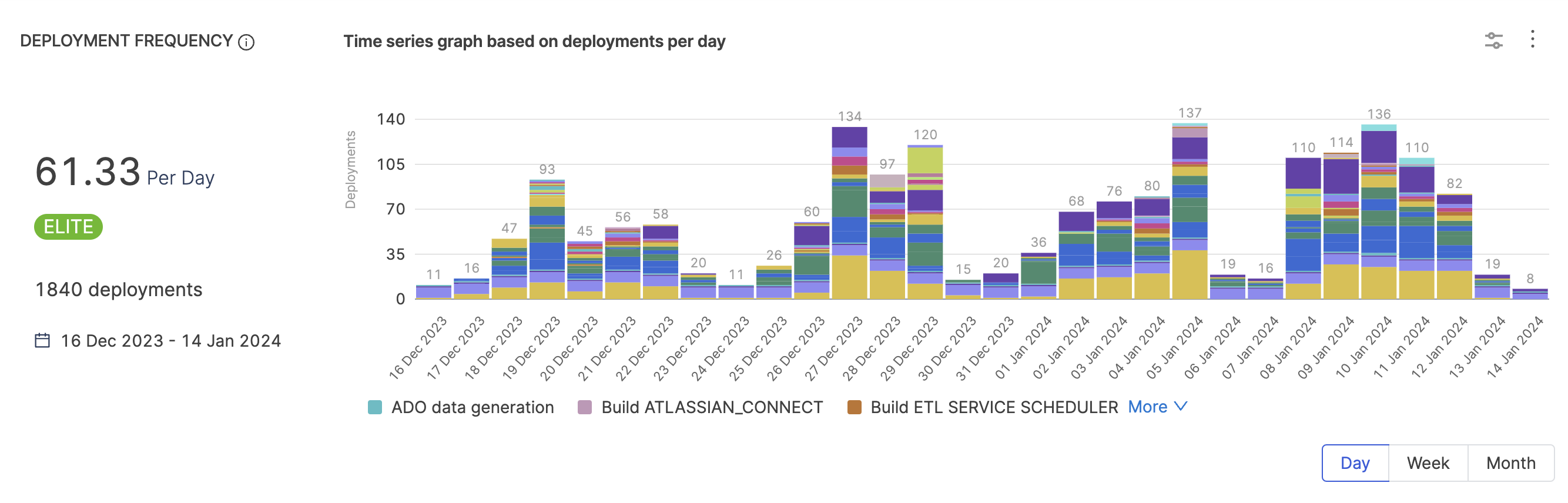 With SEI, you can use DORA Metrics Insights to examine your organization's DORA metrics. This helps you understand how your organization or team is performing and helps you get an overview of daily, weekly, and monthly trends.