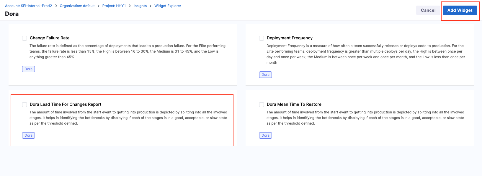 The Lead Time for Changes widget aggregates lead time across your issue management system, SCM, and CI/CD tools.